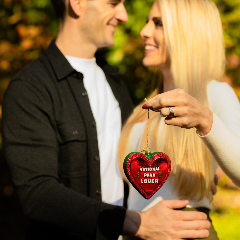 Declare your love for the wild with our ‘National Park Lover’ ornament. This radiant red heart captures the essence of those whose hearts beat for the great outdoors. Accented with twin evergreen trees and featuring a golden bison - a cherished emblem of our national parks - this ornament is a shining declaration of love for our treasured parklands. Each National Park Magic ornament is a celebration, a love letter to nature.